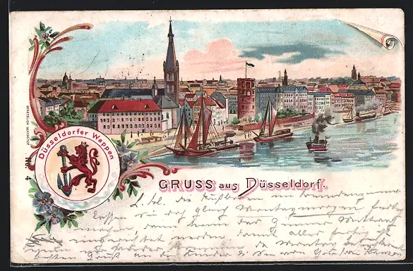 Lithographie Düsseldorf, Uferpartie mit Kirche, Wappen