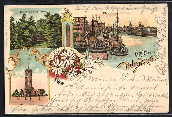 Lithographie Duisburg, Brücke und Curtius Denkmal, Hafen, Wasserturm