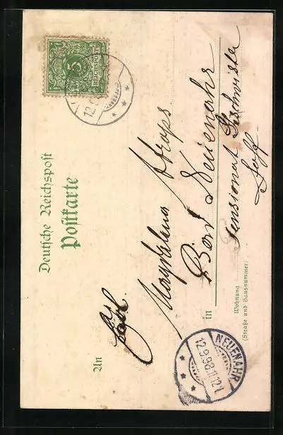 Personenbezogene Daten auf der Rückseite der Karte wurden durch blauen Textmarker unkenntlich gemacht. Die blauen Stellen sind auf die Vorderseite durchgeweicht und wirken sich negativ auf das Postkartenfoto aus