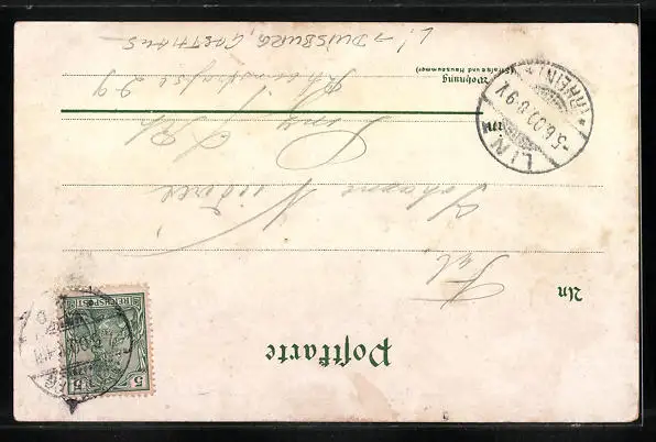 Personenbezogene Daten auf der Rückseite der Karte wurden durch blauen Textmarker unkenntlich gemacht. Die blauen Stellen sind auf die Vorderseite durchgeweicht und wirken sich negativ auf das Postkartenfoto aus