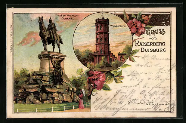 Lithographie Duisburg, Kaiserberg, Wasserturm, Kaiser-Wilhelm-Denkmal