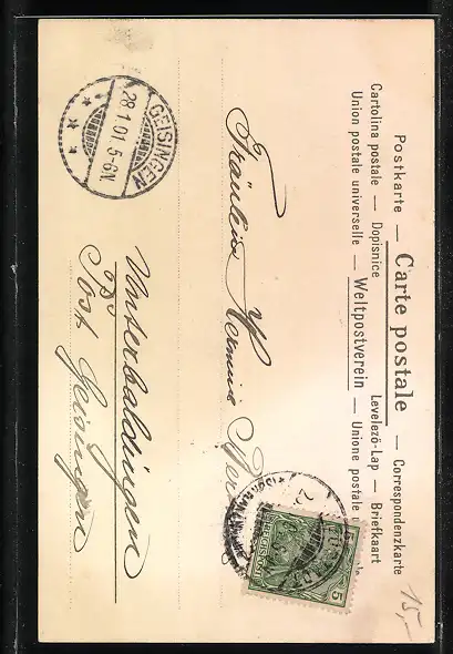 Personenbezogene Daten auf der Rückseite der Karte wurden durch blauen Textmarker unkenntlich gemacht. Die blauen Stellen sind auf die Vorderseite durchgeweicht und wirken sich negativ auf das Postkartenfoto aus