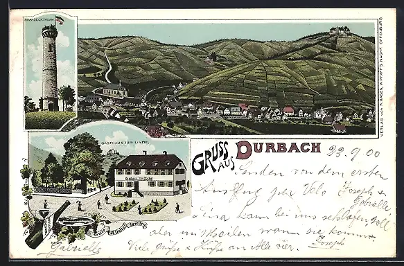 Lithographie Durbach, Totalansicht, Gasthaus zur Linde, Brandeckturm