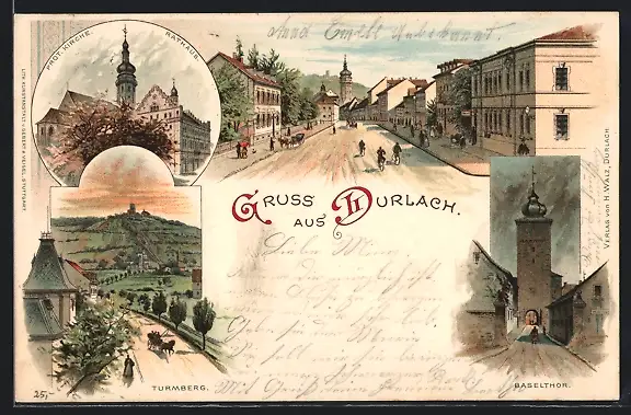 Lithographie Durlach, Basethor, Turmberg & Rathaus mit Prot. Kirche