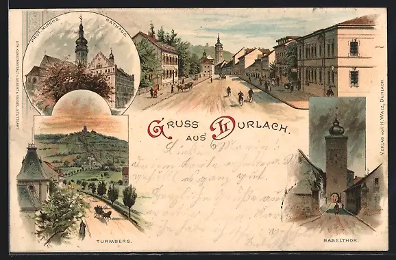 Lithographie Durlach, Basethor, Turmberg & Rathaus mit Prot. Kirche