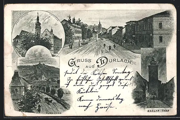 Lithographie Durlach, Basler Thor, Prot. Kirche, Rathaus und Turmberg