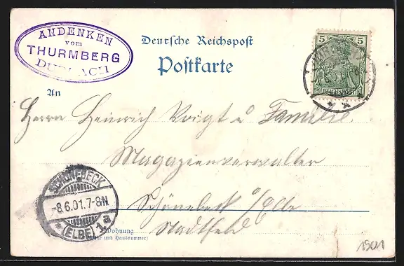 Personenbezogene Daten auf der Rückseite der Karte wurden durch blauen Textmarker unkenntlich gemacht. Die blauen Stellen sind auf die Vorderseite durchgeweicht und wirken sich negativ auf das Postkartenfoto aus