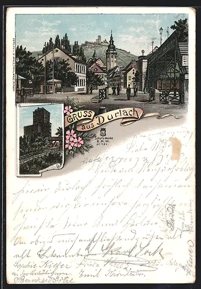Lithographie Durlach, Ortspartie mit Kirche, Burg und Turmberg