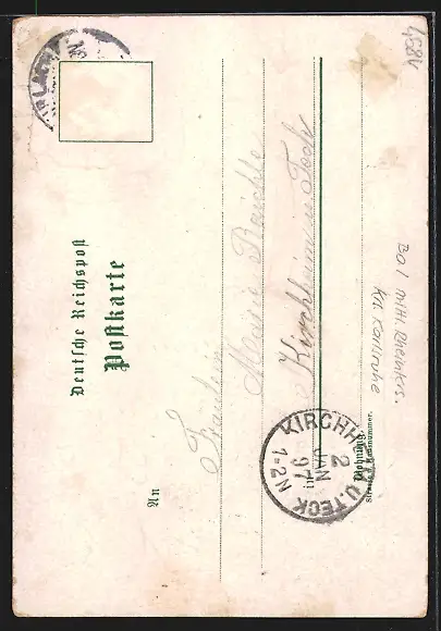 gelaufen 1897, Briefmarke entfernt, rückseitig Klebe- und Papierreste, guter Zustand