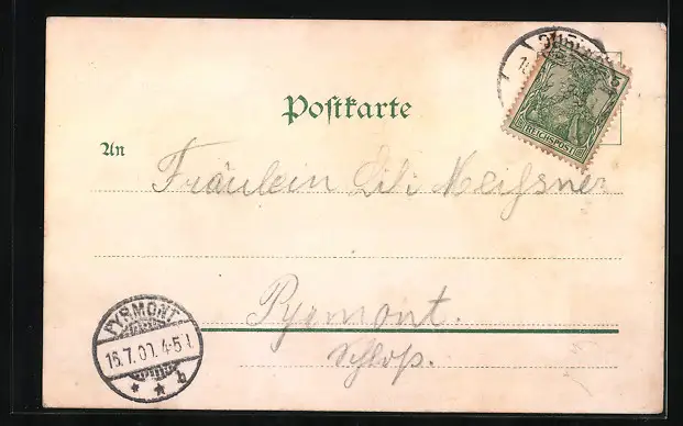 Personenbezogene Daten auf der Rückseite der Karte wurden durch blauen Textmarker unkenntlich gemacht. Die blauen Stellen sind auf die Vorderseite durchgeweicht und wirken sich negativ auf das Postkartenfoto aus