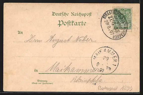 Personenbezogene Daten auf der Rückseite der Karte wurden durch blauen Textmarker unkenntlich gemacht. Die blauen Stellen sind auf die Vorderseite durchgeweicht und wirken sich negativ auf das Postkartenfoto aus