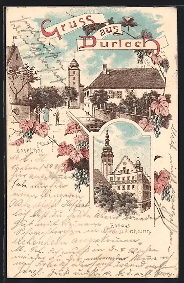 Lithographie Durlach, Strassenpartie am Baselthor, Rathaus u. Kirchturm