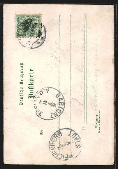 Personenbezogene Daten auf der Rückseite der Karte wurden durch blauen Textmarker unkenntlich gemacht. Die blauen Stellen sind auf die Vorderseite durchgeweicht und wirken sich negativ auf das Postkartenfoto aus