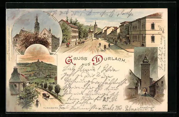 Lithographie Durlach, Strassenpartie mit Kirche, Baselthor, Rathaus
