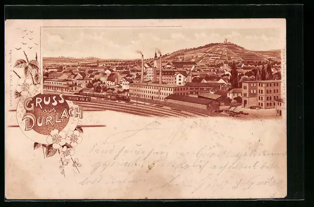 Lithographie Durlach, Teilansicht mit Bahnhof
