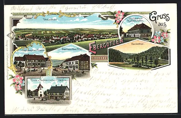 Lithographie Ebergötzen, Gasthaus Karl Frantz, Gasthof Wwe. Peter, Oberförsterei