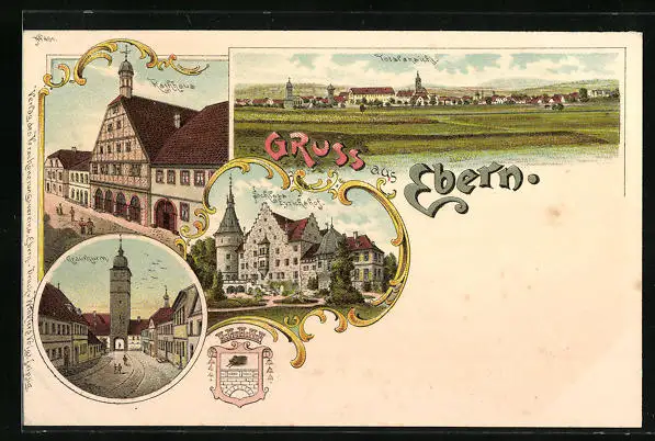 Lithographie Ebern, Rathaus, Strassenpartie am Grauturm, Schloss Eyrichshof, Totalansicht