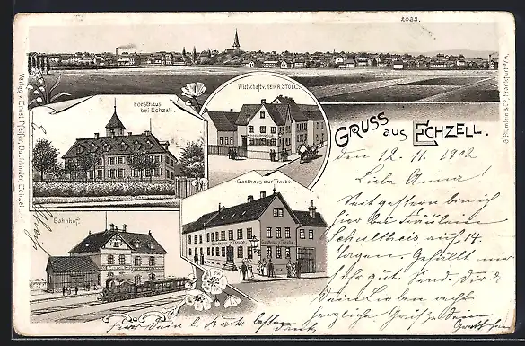 Lithographie Echzell, Gasthaus zur Traube, Bahnhof, Gasthof von Heinr. Stoll, Forsthaus