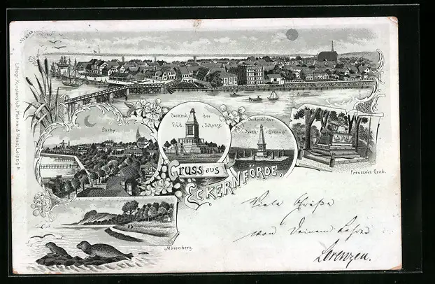 Lithographie Eckernförde, Mövenberg mit Robben, Denkmal der Süd-Schanze, Preusser`s Grab