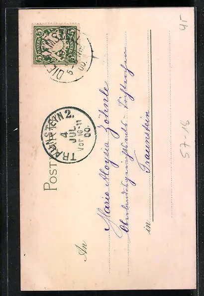 Personenbezogene Daten auf der Rückseite der Karte wurden durch blauen Textmarker unkenntlich gemacht. Die blauen Stellen sind auf die Vorderseite durchgeweicht und wirken sich negativ auf das Postkartenfoto aus