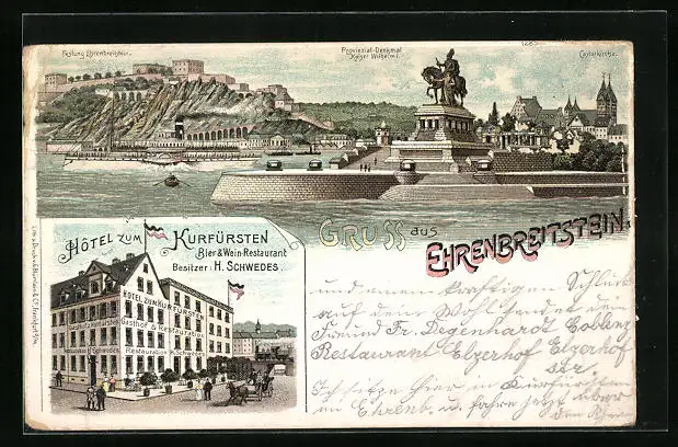 Lithographie Ehrenbreitstein, Ortsansicht mit Festung