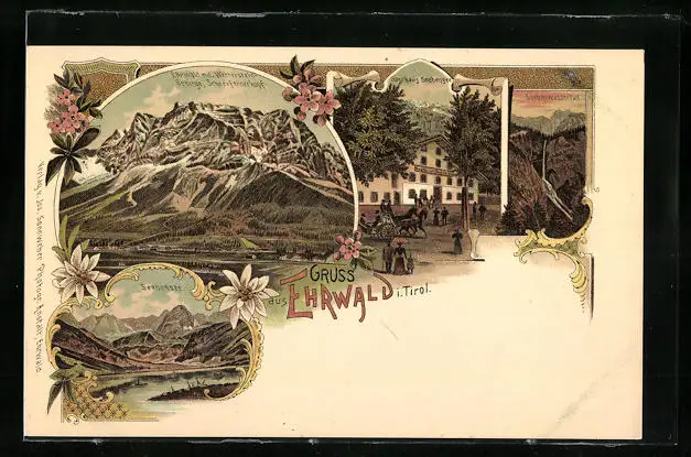 Lithographie Ehrwald, Totalansicht mit Gasthaus Seebensee