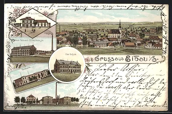 Lithographie Eibau i. S., Mech. Weberei C. F. Neumann jr., Schützenhaus, Oberschule, Panorama