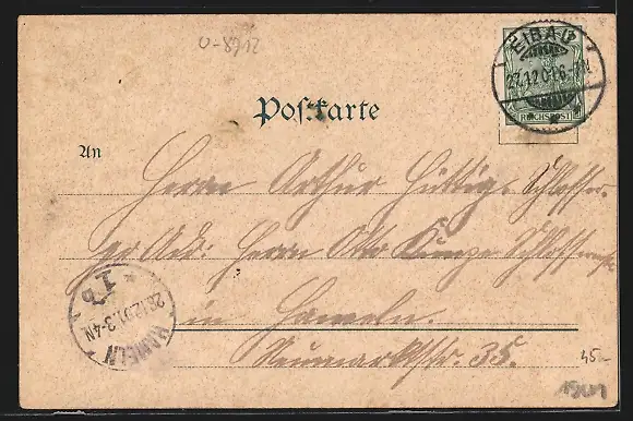 Personenbezogene Daten auf der Rückseite der Karte wurden durch blauen Textmarker unkenntlich gemacht. Die blauen Stellen sind auf die Vorderseite durchgeweicht und wirken sich negativ auf das Postkartenfoto aus