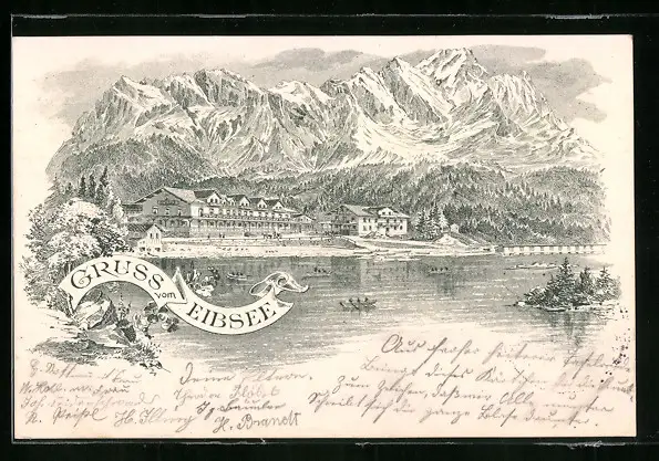 Lithographie Eibsee, Hotel mit Bergpanorama