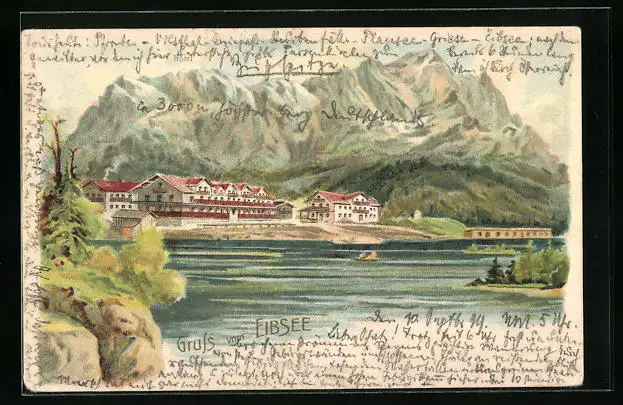 Lithographie Eibsee, Teilansicht mit Landschaftspanorama