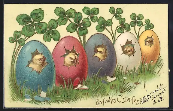 Lithographie Ein frohes Osterfest, Küken in bunten Eiern