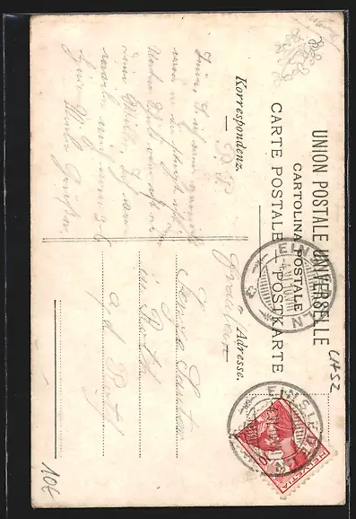 Personenbezogene Daten auf der Rückseite der Karte wurden durch blauen Textmarker unkenntlich gemacht. Die blauen Stellen sind auf die Vorderseite durchgeweicht und wirken sich negativ auf das Postkartenfoto aus