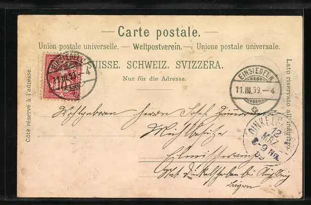 gelaufen 1899, Eckknick re. oben, Bugspuren li. oben, Stempelspur, guter Zustand