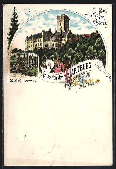 Lithographie Eisenach, Ansicht der Wartburg mit Elisabeth-Brunnen