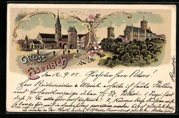 Lithographie Eisenach, Karlsplatz, Wartburg