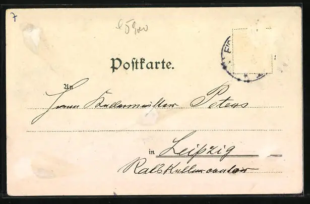 Personenbezogene Daten auf der Rückseite der Karte wurden durch blauen Textmarker unkenntlich gemacht. Die blauen Stellen sind auf die Vorderseite durchgeweicht und wirken sich negativ auf das Postkartenfoto aus