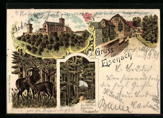 Lithographie Eisenach, Wartburg, Hirsche, Wartburghof