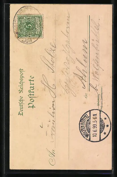 Personenbezogene Daten auf der Rückseite der Karte wurden durch blauen Textmarker unkenntlich gemacht. Die blauen Stellen sind auf die Vorderseite durchgeweicht und wirken sich negativ auf das Postkartenfoto aus