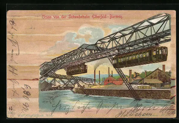 Lithographie Elberfeld-Barmen, Ansicht der Schwebebahn