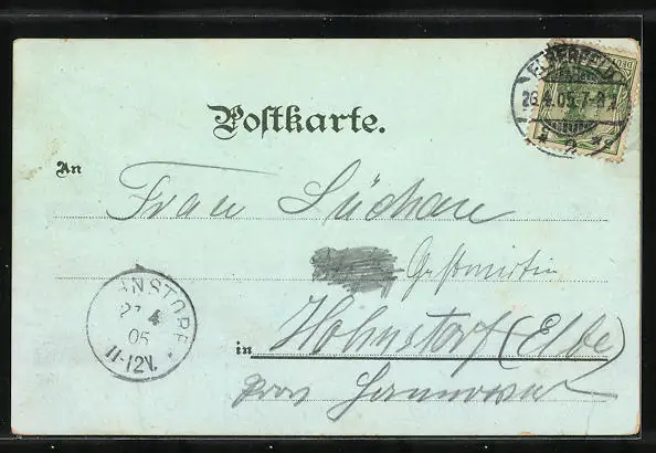 Personenbezogene Daten auf der Rückseite der Karte wurden durch blauen Textmarker unkenntlich gemacht. Die blauen Stellen sind auf die Vorderseite durchgeweicht und wirken sich negativ auf das Postkartenfoto aus