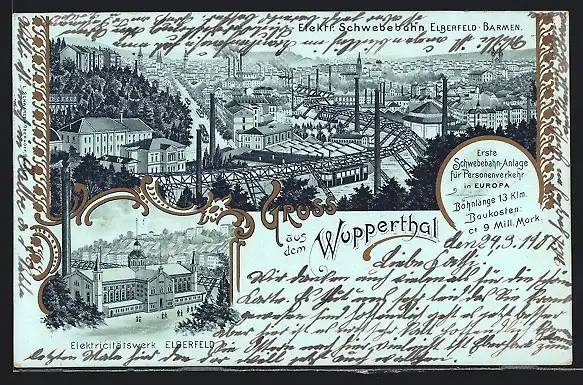 Lithographie Elberfeld-Barmen, Totalansicht mit Schwebebahn, Elektrizitätswerk