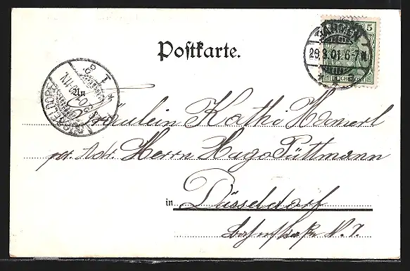 Personenbezogene Daten auf der Rückseite der Karte wurden durch blauen Textmarker unkenntlich gemacht. Die blauen Stellen sind auf die Vorderseite durchgeweicht und wirken sich negativ auf das Postkartenfoto aus