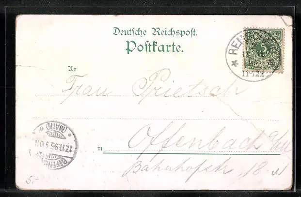 gelaufen 1895, Eckschaden links oben, Stempelspur, Bugspuren mittig