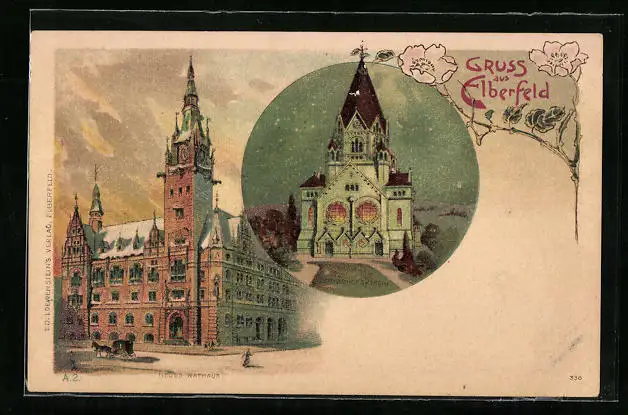 Lithographie Elberfeld, Neues Rathaus, Friedhofskirche