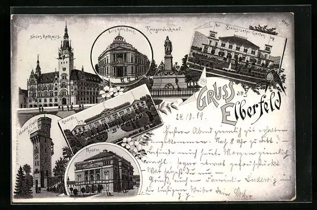 Lithographie Elberfeld, Neues Rathaus, Kriegerdenkmal, Zoologischer Garten