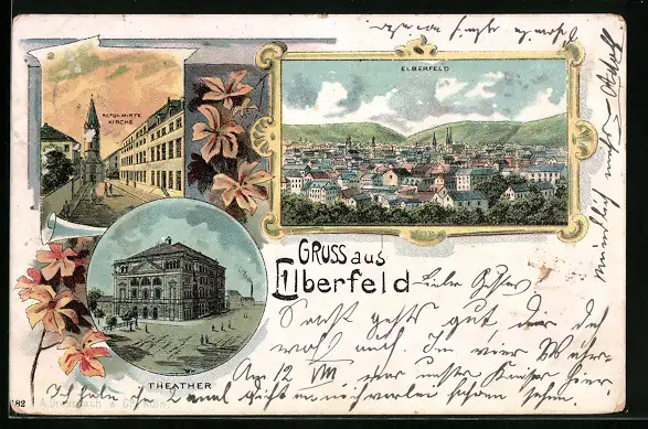 Lithographie Elberfeld, Ortsansicht, Reformierte Kirche, Theater