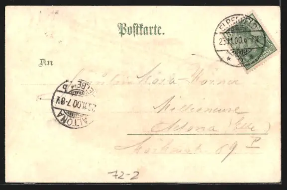 Personenbezogene Daten auf der Rückseite der Karte wurden durch blauen Textmarker unkenntlich gemacht. Die blauen Stellen sind auf die Vorderseite durchgeweicht und wirken sich negativ auf das Postkartenfoto aus