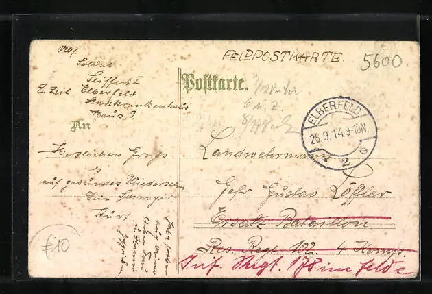 gelaufen als Feldpost 1914, Eckknicke re. oben u. li. unten, guter Zustand
