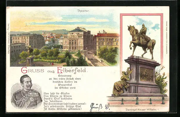Lithographie Elberfeld, Theater, Denkmal Kaiser Wilhelm I., Wilhelm II.