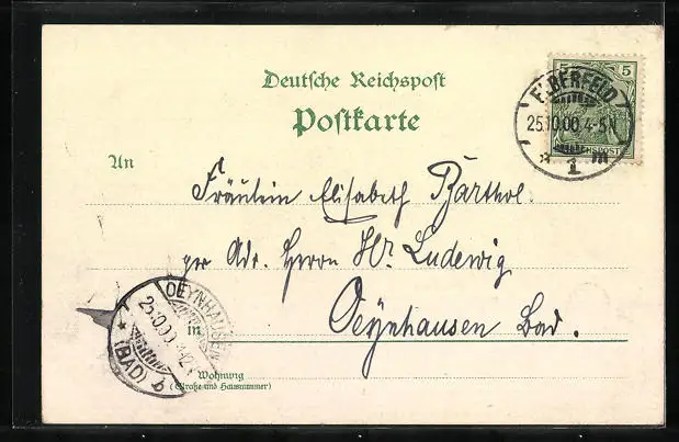 Personenbezogene Daten auf der Rückseite der Karte wurden durch blauen Textmarker unkenntlich gemacht. Die blauen Stellen sind auf die Vorderseite durchgeweicht und wirken sich negativ auf das Postkartenfoto aus